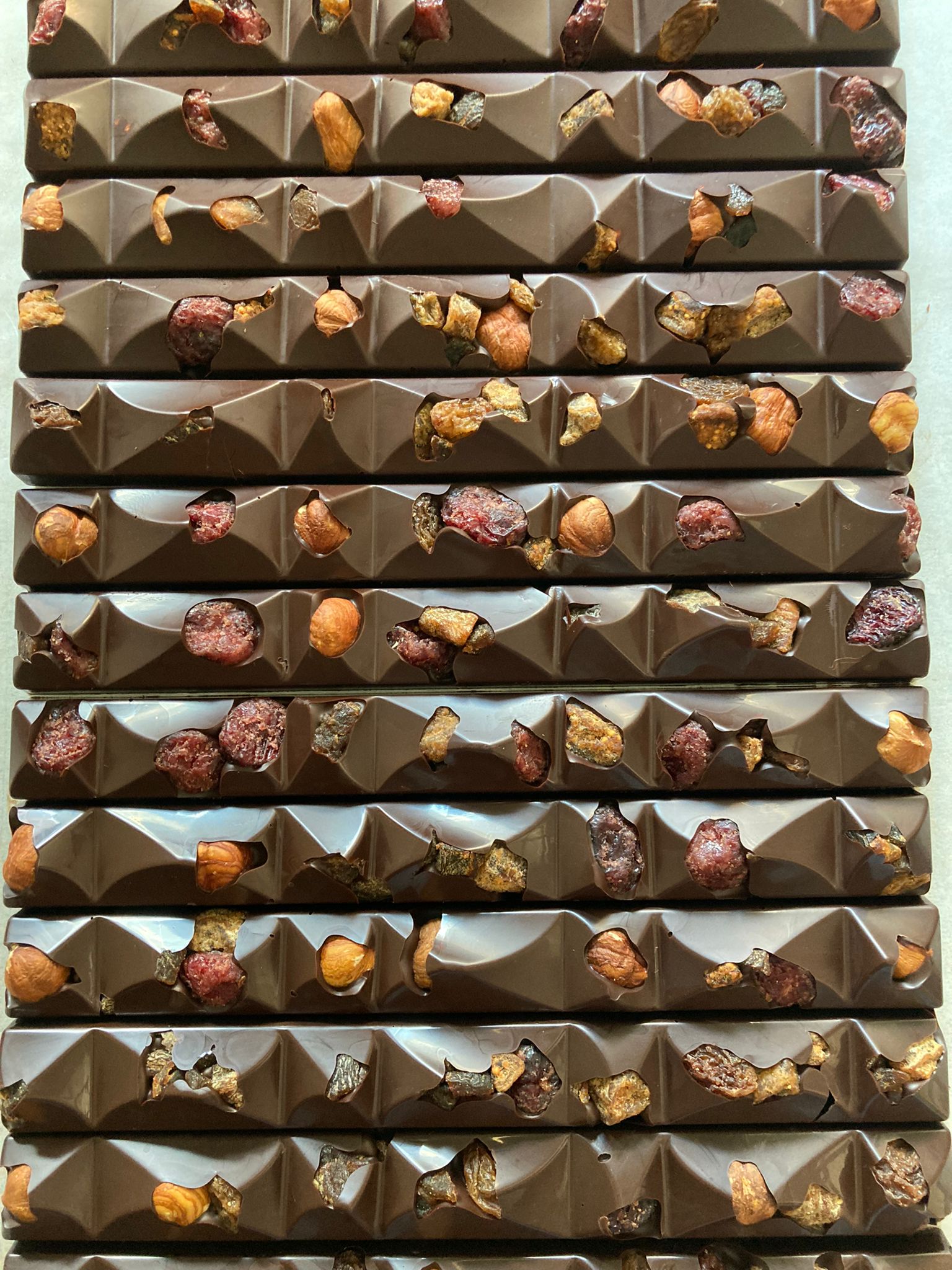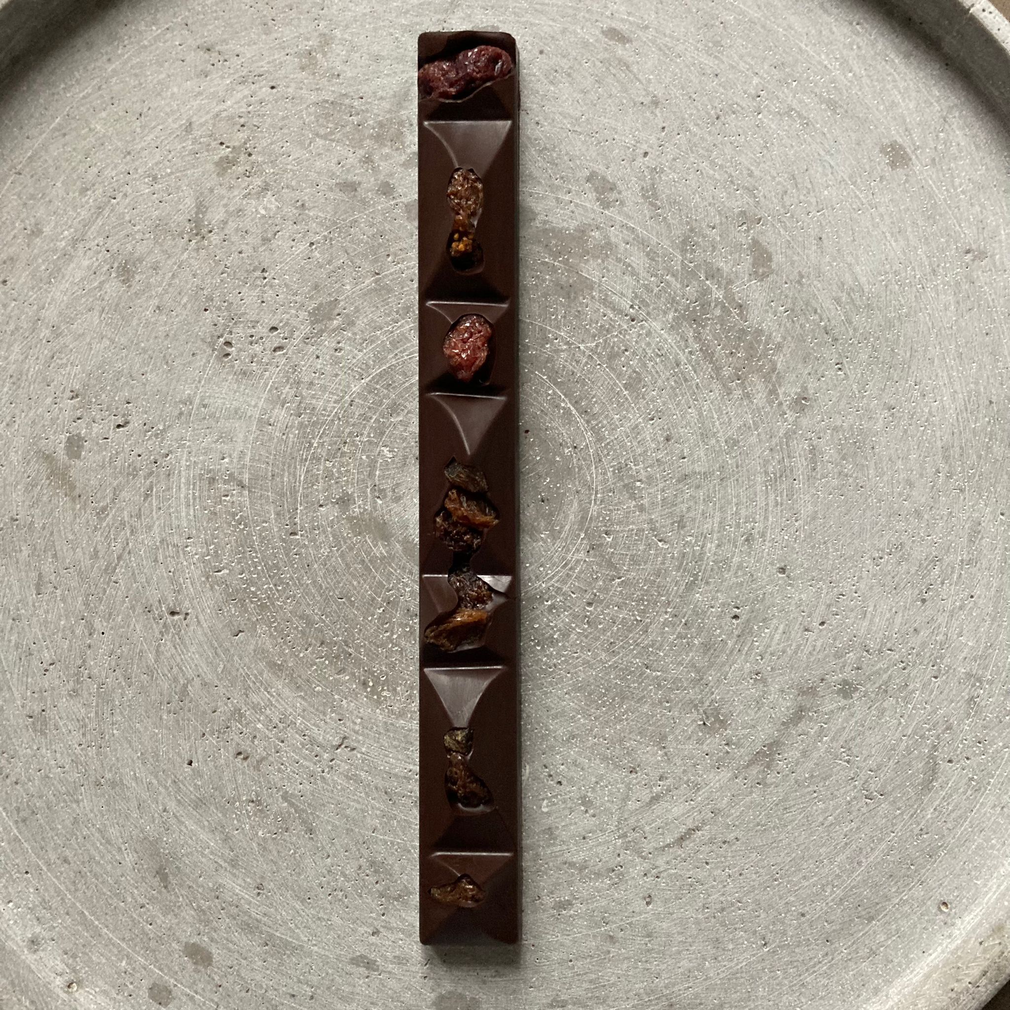 Étiquettes : abricot, barre chocolat noir, barre chocolat vegan, chocolat et fruits secs, chocolat noir, cranberry, figue, noisette, vegan